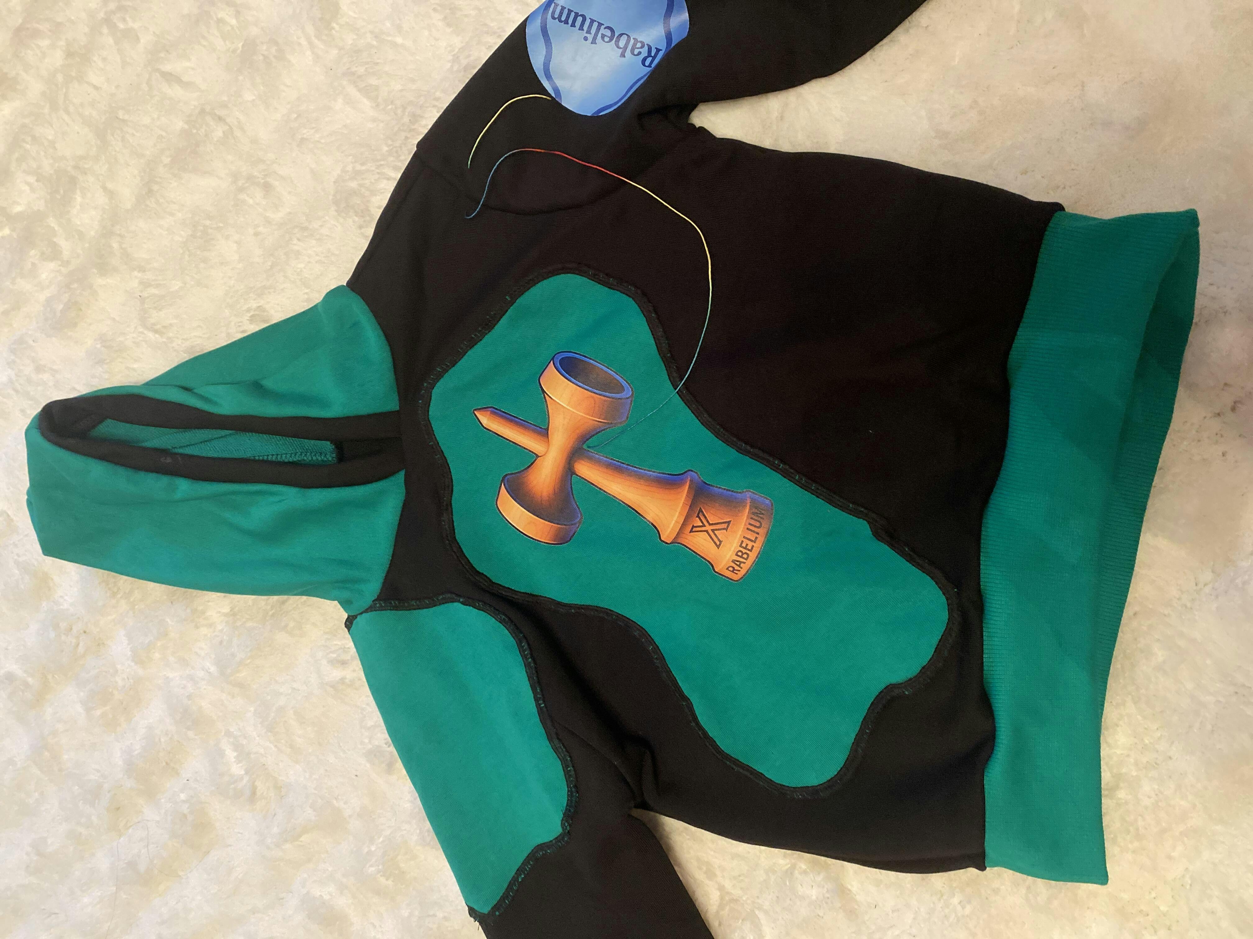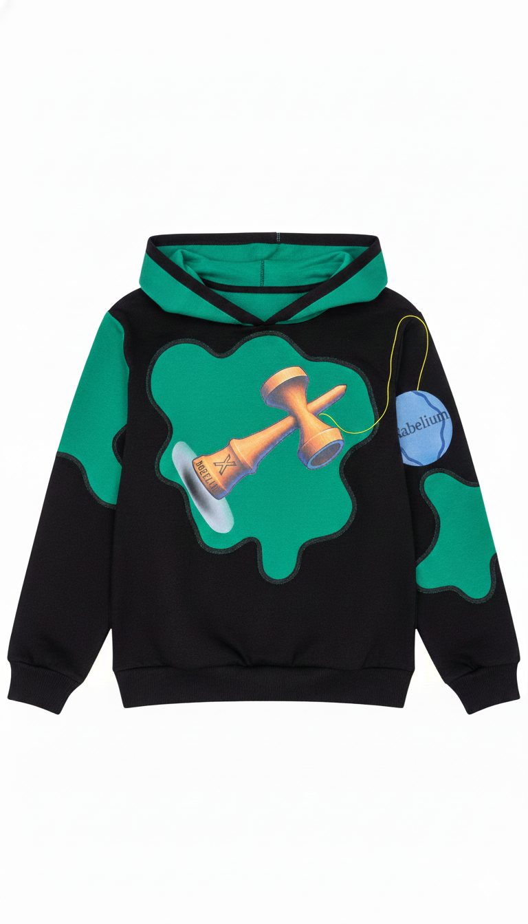 Elementul care îl face cu adevărat special este ața reală cusută manual, aceeași ață folosită la kendama, care leagă printul bilei de pe mânecă de printul kendamei de pe piept. Nu este un artificiu grafic, ci un detaliu autentic, cusut fizic în hanorac — un accent unic, exclusiv RABELIUM, care transformă piesa într-un obiect de colecție pentru pasionați.
